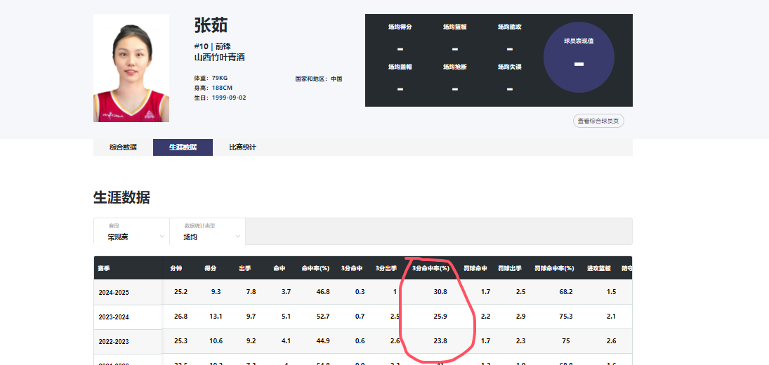 三场比赛,张茹共出战两场,累计出手7次只命中1球,场均得分数仅为1.5分,且在比赛中多次出现空位不出手的情况。