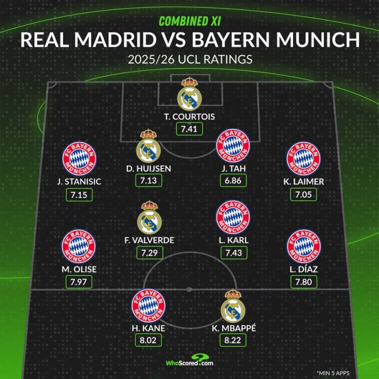whoscored列皇马拜仁欧冠评分合体阵:至少出场5次